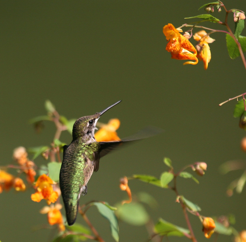 "A study found that even though bumblebees also visit jewelweed, hummingbirds do a far better job at pollinating it. This is because when a hummingbird visits the flower, it causes the flower to wobble and this wobbling rubs lots of pollen on the bird’s face. When the bee visits jewelweed, its movements are more delicate. The flower stays still and the bee leaves with less pollen to take to the next flower."